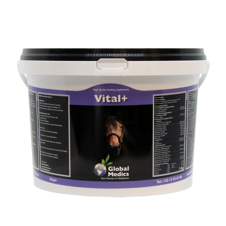 Global-MedicsVital+ est un complexe équilibré de multivitamines et de minéraux pour chevaux et poulains.