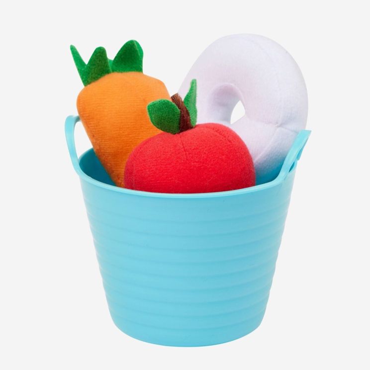 Dans ce joyeux seau à friandises en plastique, tu trouveras de délicieuses friandises: une carotte douce en tissu, une pomme juteuse et de la menthe rafraîchissante.