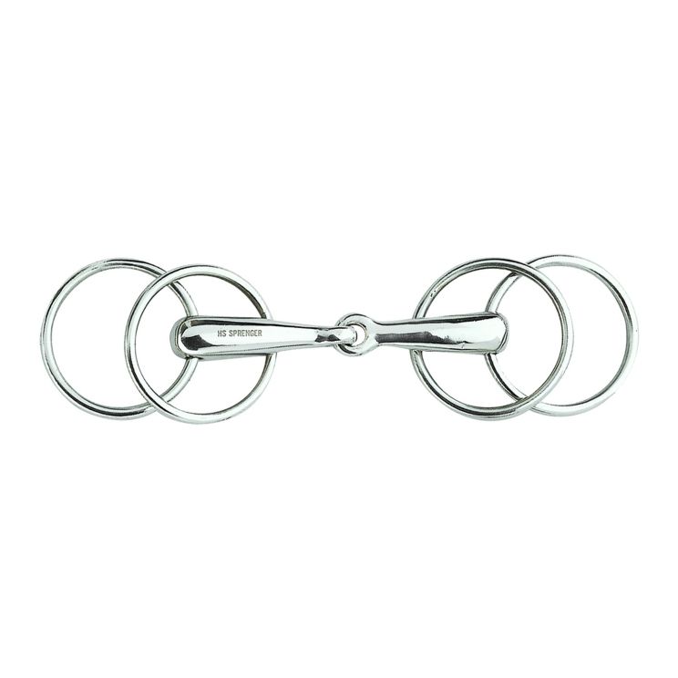SprengerMors simple brisure avec 4 anneaux. La rêne est fixée à l’anneau fixe et le montant de mors l’anneau mobile.