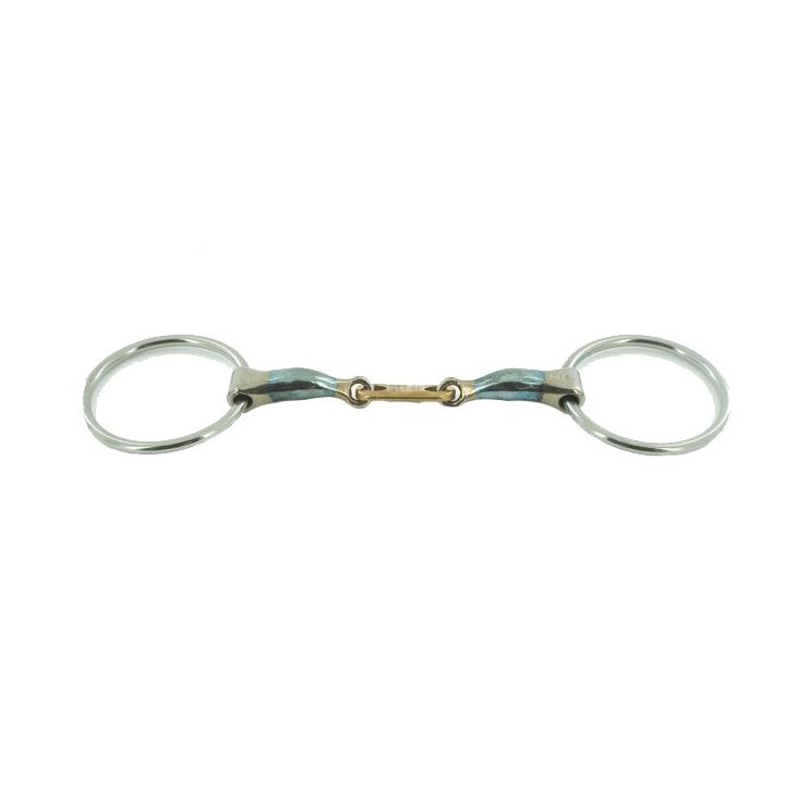 TrustMors à anneaux Trust avec un canon de forme anatomique. Ce mors a une plaque de cuivre plate au milieu, lorsque le cheval pousse sa langue vers le haut ou devient fort dans la main, la plaque crée une pression supplémentaire sur la langue.