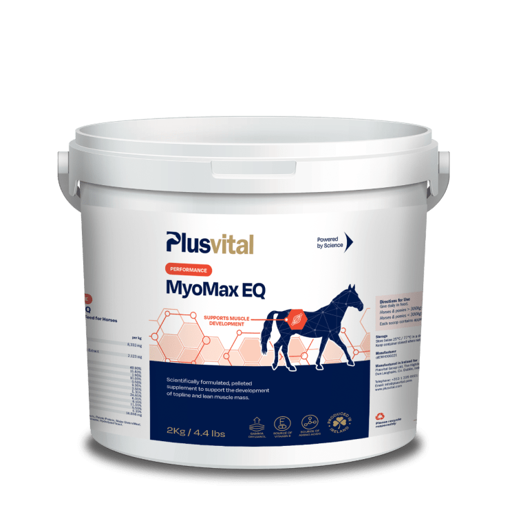 Plusvital Myo-Max EQ is een wetenschappelijk geformuleerd, gepelleteerd supplement dat is ontwikkeld ter ondersteuning van de ontwikkeling van de bovenlijn en magere spiermassa bij paarden.